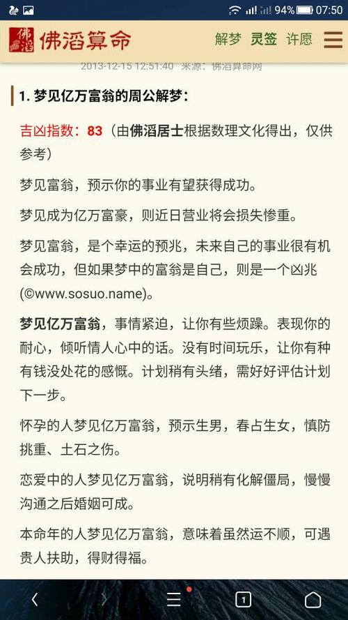 周公对梦见商人或富翁的解释:·梦见一个商人或一个富人是一个幸运的预兆。他将来有机会成功,但如果梦中的富人是他自己,那将是一个凶猛的预兆。周公关于梦见商人或富人的梦想和解释:·商人梦见一对蛇,说能发大财。·商人梦见在水库洗澡,这意味着他们将在不久的将来做大生意。·商人梦见与警察交谈,说要提防竞争对手。·商人梦见洗脚,表示贪婪。·梦见敌人拿着剃刀砍杀别人,表示会得到朋友的酬报。·商人梦见拯救为自己工作的人,说他们会幸福。·商人梦见从悬崖上摔下来,说明生意会突然受到冲击。·商人梦见恨自己的顾客,说明顾客络绎不绝,利润倍增。·商人梦见自己长了很多脚,说明你很会赚钱。·商人梦见收到别人赠送的剑,说会把竞争对手挤走。·商人梦见进入寺庙,说生意会大亏。·梦见商人或富人是幸运的预兆。他们将来有机会成功,但如果梦中的富人是他们自己,那将是一个凶猛的预兆。·商人梦见自己在理发,这意味着你可以赚很多钱。·商人梦见在滑冰,表示生意会萧条。·商人梦见玫瑰,说很快就会成为百万富翁。·商人梦见给别人理发,表示生意能获利。·商人梦见许多青蛙,说他们可以发大财。·商人梦见跑步,说能赚大钱。·商人梦见有很多财产,这意味着生意将遭受巨大损失。·商人梦见冰,说明生意兴隆。·商人梦见与导师交谈,说吸收新合股人可以发大财。·商人和店主梦见向神献供品,说要发大财。·商人梦见乌龟,说出国做生意,能发大财。·商人梦见青蛙,说生意要赔钱。·商人梦见拔牙,说他们将能够做一笔大利生意。·商人梦见鲨鱼,说漂洋过海做生意,能赚大钱。·商人梦见上学,说出国做生意可以赚很多钱。·商人梦见画,说会遭受损失。·商人梦见乌鸦,说连续亏损最终会导致所有生意破产。·商人梦见喝了一杯茶,说要乘船出国。·商人梦见和朋友一起去看戏剧,说生意兴隆。·商人梦见交税,说明是发财的吉兆。漂洋过海做生意,能发大财。·商人梦见唱歌,说生意突然萧条。·商人梦见骑斑马,说生意可以在国外发展。·商人梦见自己成了小贩,说生意会萧条,可能会倒闭。·商人梦见蚂蚁游行,说生意兴隆。·商人梦见获奖,说漂洋过海做生意,能发财。·商人梦见海洋,说生意兴隆,遍布全国。·商人梦见旅行者,说生意会破产。·商人梦见会见未开化的人,说不久就要出国发大财了。·商人梦见自杀,说会得到好处。·商人梦见叫喊,表示生意会大亏损,甚至破产。·商人梦见写信,说生意会发展到国外。·商人梦见塔,说能赚大钱。·商人梦见加入比赛,说开始做新生意,会损失很多钱。·商人看到监狱,说生意会受损。·商人梦见航海,说能发大财。·商人梦见打鼾,说他们会杀死商业竞争对手。但游客梦见打鼾,并在旅途中赔钱。离开家的人梦见打鼾,很快就会和家人团聚。·商人梦见皇后,说出国做生意可以发大财。·商人梦见参加野餐,说生意会受挫。·商人梦见去朝圣,这意味着海上交易会增加。·商人梦见自己脸色苍白,说明收入会减少。·商人梦见天堂,说生意能赚大钱,因为商品的需求会突然飙升。·商人梦见看报,说要发财。·商人梦见脱俗,说生意会发财。