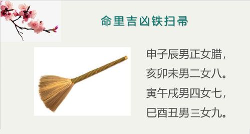 铁扫帚,无论何时,都是凶星,女人打铁扫帚最不吉利,克夫再婚,乖背破家。根据披口传,男和女命一样,命犯铁扫帚也不吉利。所有下属相的男女都犯了铁扫帚。申(猴)子(鼠)陈(龙):正月男生 十二月出生的女性 (猪)毛(兔)未(羊) 女出生 在八月 阴(虎)午(马)徐(狗) 女出生 在九月 六月出生的男性(蛇)酉(鸡)丑(牛) 女出生 在十月 铁扫帚也有吉凶之说。早上出生的人,命犯铁扫帚就是把家财扫到外面,越扫越穷,这样的生活就不好了。