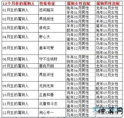 三、一月至十二月属狗的生肖婚配表: