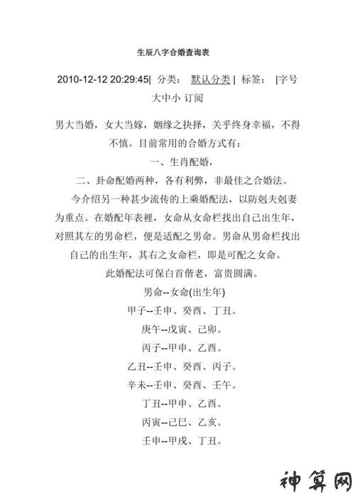 八字合婚表的特点 八字结婚表大大小小,意思是男女生活的结合是好的。比如男人的生命应该结合庚申年(1973)、辛酉年(1973)、甲子年(1973)的生命。如果一个女人出生在一个丑陋的年份(1965年和1968年),她需要从一个女人的生日栏中找到自己的生日,她的男人的生活栏可以和她的男人的生活结合起来,也就是说,一个丑陋的女人的生活应该和乙思(1965)或戊申年(1968)的男人的生活结合起来。本表的主要特点是男女年柱相生为主,不强迫男女大命相生。如果双方年柱相生,年命又相生,自然不错。比如甲徐男结合自己的毛妇,即年柱天地相合,又一火命,一土命,属于相生。