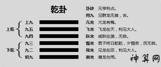 乾卦的一句话是:初九,不要用潜龙;九二,看到龙在田里,利见大人;九三,君子整天干,没有责备;九四,或者跳在渊里,没有责备;九五,飞龙在天,利见大人;九、亢龙后悔;九、看龙无首,吉祥。