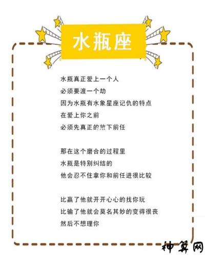 水瓶座的爱情有章可循。他们不是不讲理的人。只要注意沟通,及时表达意见,就会认真考虑。同时,水瓶座是一个渴望自由的人。他们注重界限,需要有自己的私人空间。因此,无论是恋爱还是交朋友,他们都必须注意不要干涉自己的选择,给自己空闲空间。水瓶座最不可抗拒的是真诚。只要每个人都真诚相待,水瓶座就会非常愿意和你相处。