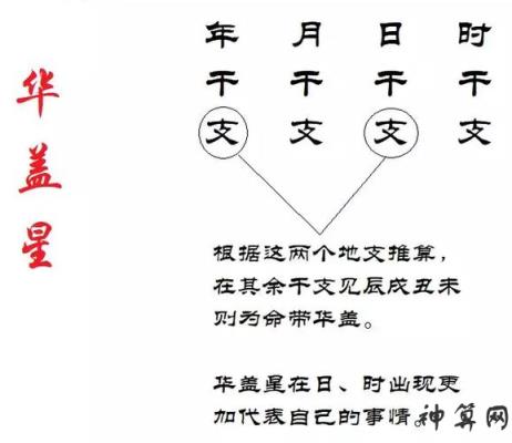 华盖星最初属于天星,所以主吉,但如果凡人得到它,就会有空虚的抱负,时运不好。命书说,凡人若得到华盖,大多一生孤独寡和,即使富贵也难免孤独。华盖只象征着一种天赋,所以它必须落在后面 只有掌握权威,才能有用。《论壶中子》一书说,华盖命多为那个 一些从事艺术的人,俗话说,自古以来,文人多薄命,空怀抱负去黄泉。看一个人华盖是吉是苦,主要看他命中有没有禄,有禄则说明才华有地方施展,没有禄则一生不会有太大的成就。