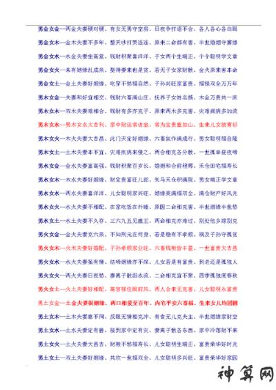 八字婚姻公式 要说合婚行不行,第一年看五行。 相生最好,比劫次之中等。 再看年柱正五行,相生相合婚可成。 相克相战婚不长,刑冲六害不可行。 生命不能分散,刑冲吵了一辈子。 第二,看时间支正五行,最好相合相生。 刑冲克害常吵闹,不吵不闹,生病。 三看日柱双五行,财官正合最有情。 不管其他干支,最好对方有正星。 五行荣枯可以互补,如果有战斗控制。 绝对相配世界少,不犯大忌就结婚。