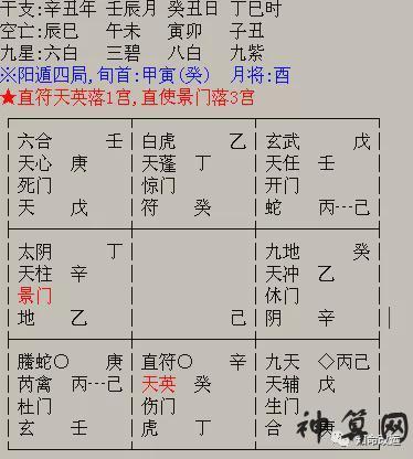 3.如果以上庚格没有出现,是以时干为神的,可以根据时干所临九星使用另一种庚格法定应期。也就是说,时干临阴星,看庚上之干;时干临阳星,看庚下之干为应期。
