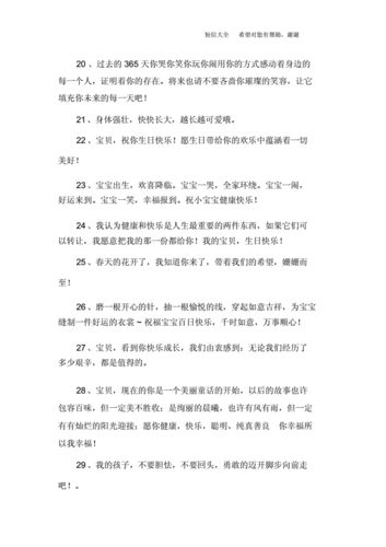 18、宝贝,现在你是一个美丽童话的开始,未来的故事可能包容,但必须美丽;是华丽的黎明,可能有风雨,但必须有灿烂的阳光迎接;宝贝,告诉你,人是1,健康、幸福、成就、名声、财富将是背后的0。我们祝需要,无数的0都属于你。宝贝,你很高兴,所以我很高兴!