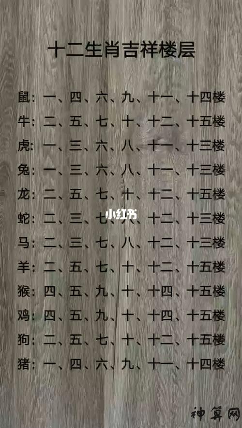 属鼠生肖吉利楼层应为1、4、6、9、11、14层,不吉利楼层有3、5、8、10、13、15层。 属牛的生肖吉利楼层应为2、5、7、10、12、15层,不吉利楼层有3、4、8、9、13、14层。 属虎的生肖吉利楼层应为1、3、6、8、11、13层,不吉利楼层有2、4、7、9、12、14层。 属兔生肖吉利楼层应为1、3、6、8、11、13层,不吉利楼层有2、4、7、9、12、14层。 属龙生肖吉利楼层为2、5、7、10、12、15层,不吉利楼层为3、4、8、9、13、14层。 属蛇生肖吉利楼层应为2、3、7、8、12、13层,不吉利楼层应为1、5、6、10、11、15层。
