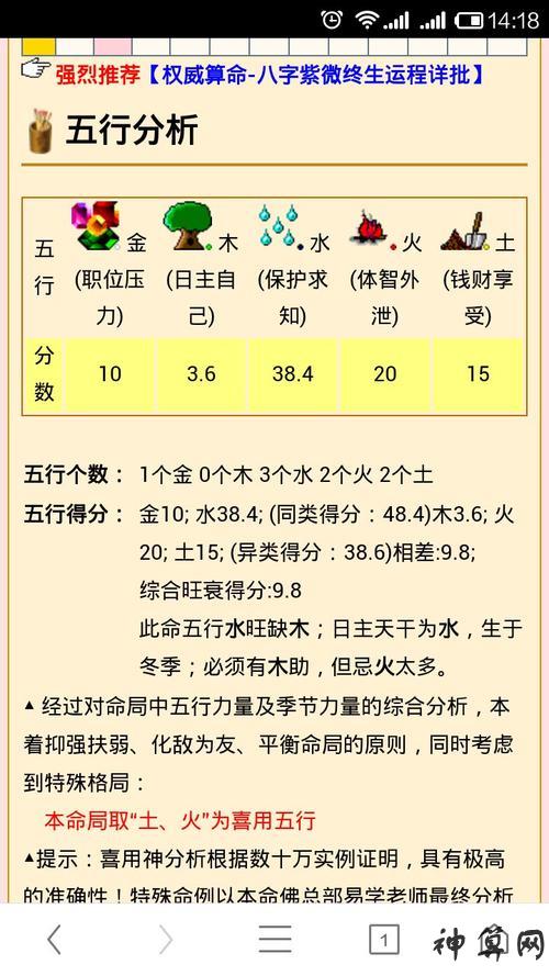 五行分析:五行【土旺】【缺火】,年命纳音五行为【壁上土】,年干支为【辛丑】,日主天干为【水】
