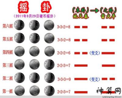 具体的摇卦方法 先准备三枚铜币。 无字的一面叫背面,有汉字的一面叫正面。 摇卦时,只需写下每次摇卦出现几个背面,共摇六次成卦。