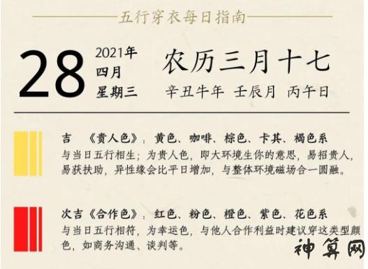 今日五行穿衣指南 【幸运五行:金】 今天,你可以穿白色、杏色、银色和金色的衣服和配饰。五行属金,这是今天五行诞生的非常吉祥的一天。 【幸运五行次吉:土】 你也可以穿黄色、棕色的衣服,或者佩戴相应属性的配饰。五行属土,和今天的五行一样。如果你得到命令,你会很开心。 【慎用色系:水】 今天避免穿黑色、灰色、蓝色的衣服或这个属性的配饰,五行属水,为当天的五行所克,自己的压力会更大。 【忌色系:火】 今天不要穿红紫色的衣服或者饰品。这种颜色的五行是火,是今天五行泄露的。容易受阻,精力不够,会很累。