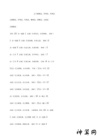 第四法:耳呜法 耳呜通常是身体问题的征兆。然而,如果只是耳呜,那就是吉凶。郑博士编辑的民间卜算耳呜法如下: 子时:(23:00-01:00)左主女思右主失财。 丑时:(01:00-03:00)左主舌右主手诉讼。 尹时:(03:00-05:00)左主失财右主心急。 (05:00-07:00)左主饮食右主客到。 (07:00-09:00)左主远行右主客到。 (09:00-11:00)左主凶事右主大吉。 下午:(11:00-13:00)左主远信右亲。 未时:(13:00-15:00)左主饮食右远人。 (15:00-17:00)左主行人右主喜事。 酉时:(17:00-19:00)左主失财右主大吉。 徐时:(19:00-21:00)左主饮食右主客到。 亥时:(21:00-23:00)左主吉右主饮食。