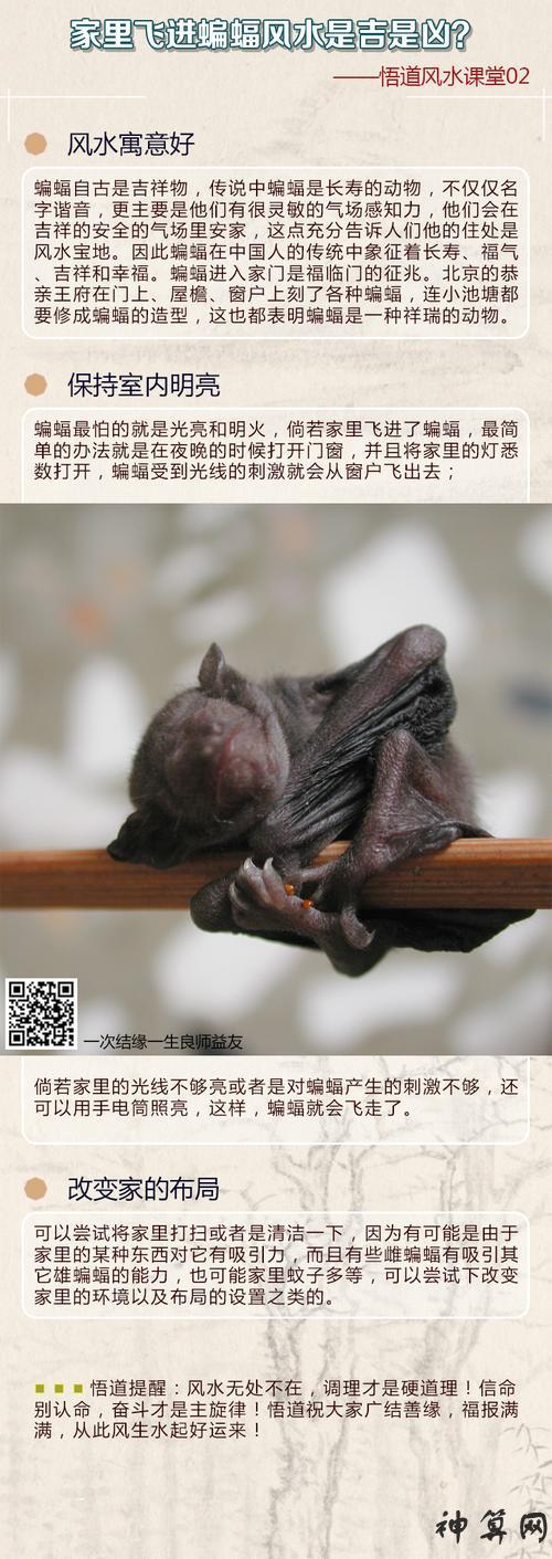 家里飞蝙蝠风水解说员 民间说蝙蝠的谐音是“福”,意思是好运。而且他们很少飞到别人家。一般晚上飞到别人家,经常被花草河包围,说明是大家庭,占地面积大,环境优美。