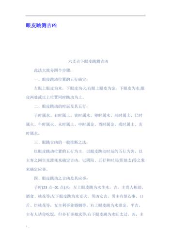 眼睛跳测吉凶六卦是一种中国民俗,又称六神通,意思是从眼睛分析未来的转世、命运、婚姻、财富等变化,通常分为吉凶六卦,包括离、震、浔、坎、根、兑六神。它与每个人出生的天干之间的关系决定了它的人生方向,也可以用来预测未来的发展趋势。