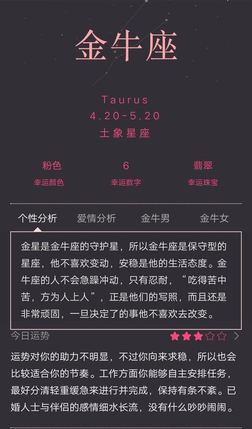 感情–对金牛座来说,有时他们渴望有一段持久的关系,他们会努力得到它。金牛座最幸运的数字是2,它们是粉红色、黄色和紫色。