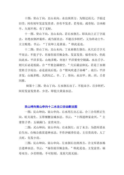 根据古籍《太平御观》,二十四山是晚清文官张之洞写的,包括当时中国的国界地理条件和各州的诸侯。其中,十二水口是二十四山中可以连接的重要流域。十二水口的吉凶大致可以分为三类,即吉凶兼备,有一定的吉凶和完全的吉凶。