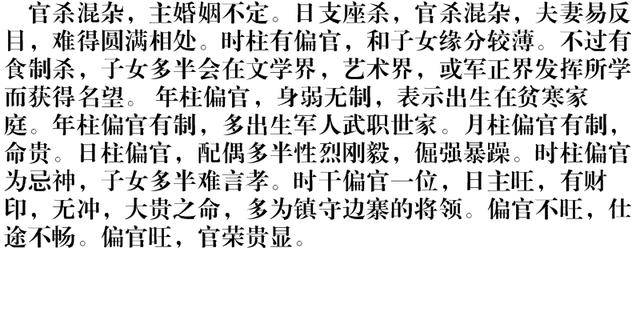 八字偏官的意义为了预测一个人的事业、财富和官运,八字偏官可以分为三类:官禄、食伤、财富。官禄是指八字中每个字的宫位所代表的官位。食伤是指八字中每个字的宫位所代表的食物量。财富和丝绸是指八字中每个字的宫位所代表的财务收入。根据八字偏官,可以预测一个人未来的运势,如升官发财、失财失官等,也可以推测一个人的性格、能力和命运。