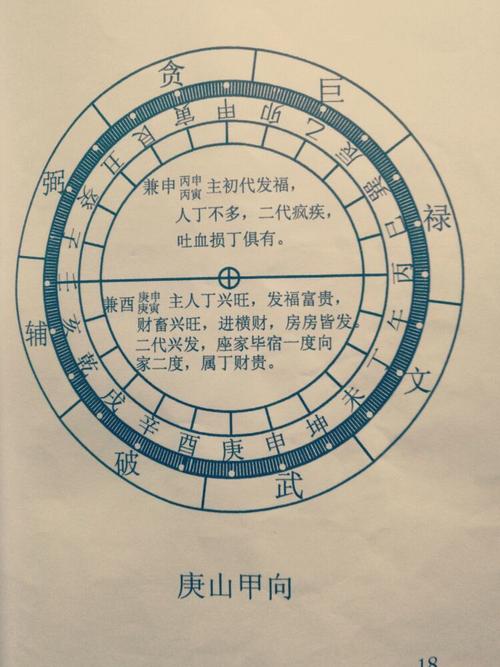 明清时期,随着对风水的深入研究,开始讨论和研究阴宅庚山甲向。比如《风水图探谱》提出了“庚山四向”的说法:“用四向,学命卦,把握风水,庚山甲向之运,克山木,避财神,制坤火,调水,保护房屋”。从这里可以看出,庚山甲向的概念实际上是根据其属性和风水知识将房屋内的物体放置在室内,以达到调节房屋内阴阳的目的。