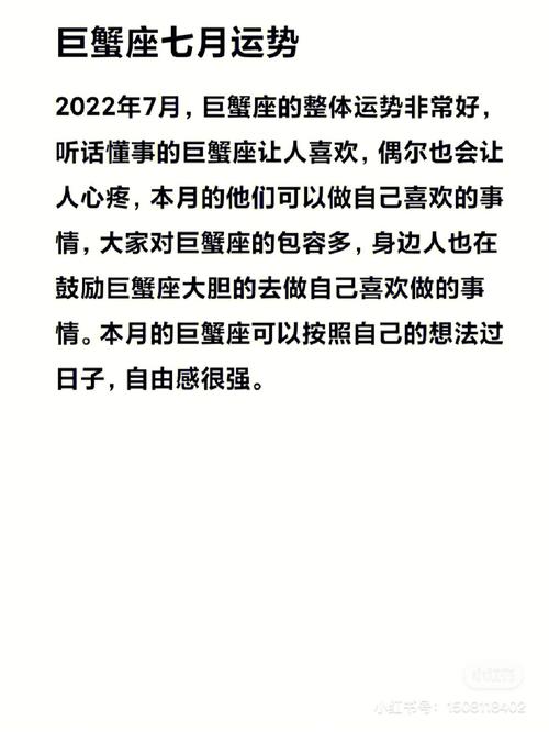 爱情:对于巨蟹座的人来说,他愿意在爱情上细致体贴。他有责任感,能做出让自己和另一半受益的决定,也能安慰另一半,让他心安理得。