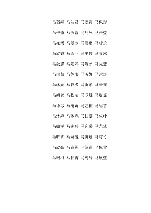 一字名在大多数情况下,一字名相对简单易懂,常见的一字名有:马娅、马萍、马琴、马衍、马璐、马童、马婷等。