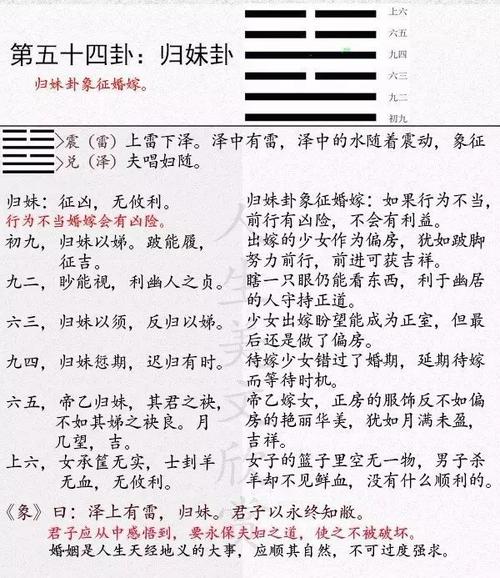 ? 归妹卦的特点归妹卦是由“坤”引起的、“兑”、“震”、“浔”由四行组成,每一行都有自己的含义。它表达了一对恋人随着时间的推移可能会有好的或坏的变化,所以归妹卦的占卜也会体现在时间的变化上。