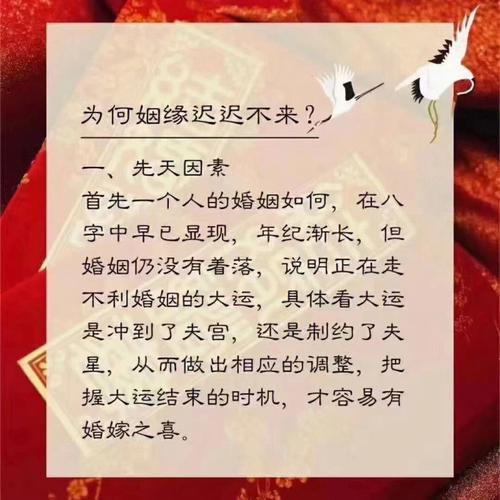 原因四:缘分缺失有时婚姻会因为缺乏命运而被推迟。命运可以被比作一张网,如果其中一个不能被连接起来,那么另一边就会失去命运,导致双方之间的婚姻被推迟。