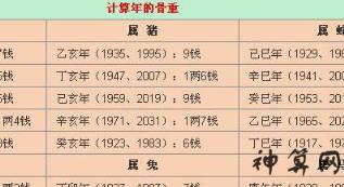 称骨理论实际上是从出生日期的八个字开始,查询相应的骨重,骨重值加起来,得到总骨重,然后比较称骨歌公式,你可以详细解释人们的生活。比如有人出生在甲子年正月初一子。与上述骨重表相比,甲子年骨重122元,正月骨重6元,初一骨重5元,子时骨重126元 。1.2年、月、日、时骨重加在一起 0.6 0.5 1.6=3.9,所以这个人的总骨重是329元,然后查看骨歌公式329元的命运。三两九钱的命运对应歌诀:少年命运不通,老享清福之命。这一生命运不通,劳作事事皆空,苦心成家计,到那时在梦中。