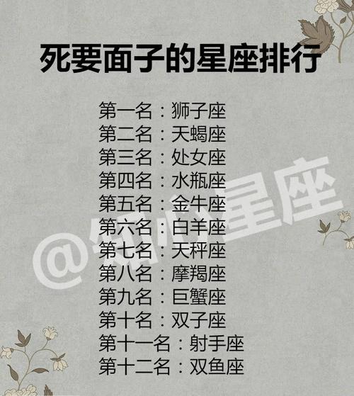 每个星座都有自己的特点和面子的原因。有些星座可能更注重自己的职业形象和声誉,而另一些星座则更注重自己的社会地位和形象。但无论哪个星座,我们都应该坚持真诚和诚实的品质,面对自己和他人。因为这才是一个人真正的优秀。