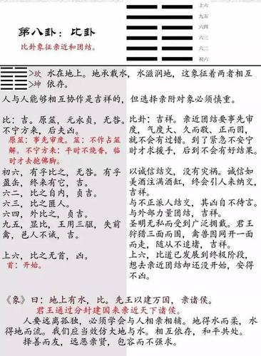 力量对抗:多端变化在水地比卦中,水地势力不断对抗,说明宇宙中存在不??势力相互竞争,不断扩大自身领土,形成多端生态系统。若说这种变化是“吉”还是“凶”,则取决于各种力量的能力水平及其表现。在水地占卜中,这种变化也代表了价值观的变化,从自力更生的概念到互助的感觉,但也代表了持续的成长和发展,从而获得更多的吉祥。