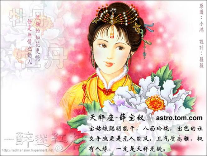 天秤代表-贾探春天秤座的人习惯于与他人合作、协调、情绪化、聪明和聪明。贾探春在《红楼梦》中扮演了一个非常重要的角色。她非常机智,而且她非常体贴地取代了她的妹妹,值得每个人学习。此外,他们也非常重视平衡和协调,不容易倾向于一方,很容易找到平衡点。