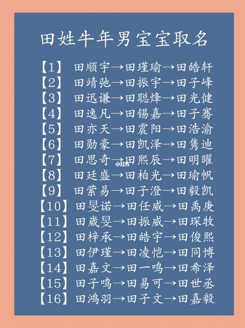 婴儿的名字是一件非常小心的事情,我相信每个父母都希望他们的孩子能有一个好的、吉祥的名字。如果婴儿是一个男孩,命名尤其重要,因为在中国传统文化中,男孩的名字起源于家庭,可以象征家庭的连续性。像“田”这样的姓很受欢迎,它来自商朝的农民的尊称。当时,有些人以田为姓,代表了他们对耕作的尊重。