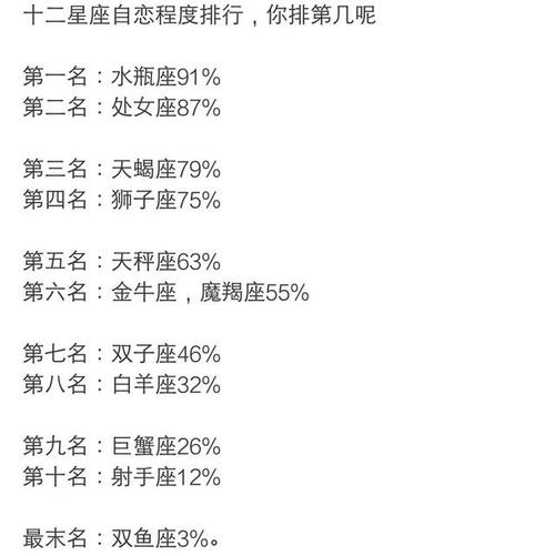 双鱼座双鱼座是一个善于表达、追求完美和浪漫的星座。他们对自己的感受和想法有很高的信心,在表达自己时会尽一切努力。然而,双鱼座的自恋程度并不高。他们更注重自己的情感和情感价值,而不是展示自己的优势。