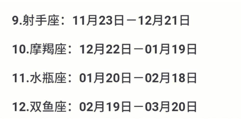 射手座(11月23日至12月21日)射手座出生于11月23日至12月21日,是十二星座中的第九个星座。它的象征是射手座,代表着自由和探索的品质。射手座的人通常是自信、乐观和冒险的人。他们喜欢自由和变化,追求精神和身体的自由。