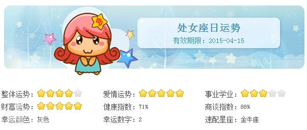 2015年处女座女孩的运势2015年是处女座女孩充满机遇和挑战的一年。在你的职业生涯中,你将有更多的机会得到认可和欣赏,但你也需要努力克服一些心理障碍和麻烦。在爱情中,你可能会感到一些曲折和挣扎,但只要你坚持和选择,你就能找到真正的幸福。