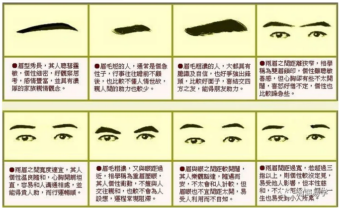 眉毛的形状和形状可以直接反映一个人的性格和命运。眉毛的基本形状包括平直型、弯曲型、抬头型和扁平型。直眉通常表现出刚毅、独立、决心;弯曲的眉毛通常表现出温柔、耐心,不容易战斗;抬眉通常表现出强烈的自尊、进取精神,更容易成功;平眉通常表示情绪不稳定,容易产生麻烦和焦虑。