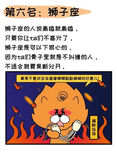 狮子座:缺乏尊重狮子座是一个追求尊重和成就的人。如果他们觉得他们的配偶没有给他们足够的尊重,他们会认为这段婚姻毫无意义,并考虑离婚。此外,狮子座需要一个能够满足他们保护和支持他们的伴侣。