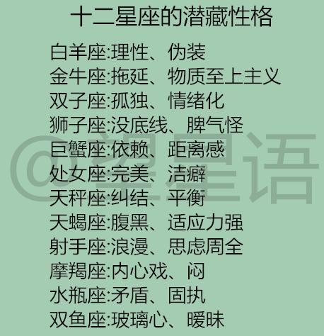 天蝎:秘密关注天蝎座的人充满了神秘感,因为他们善于隐藏自己的心,给人一种不可侵犯的感觉。他们对内心的直觉非常敏锐,对周围的事情非常警惕。然而,天蝎座的人有时太怀疑,给人一种威慑感,很容易引起人与人之间的矛盾。
