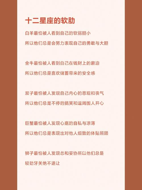 天秤座天秤座温柔优雅,但也容易犹豫优柔寡断。他们的弱点是需要平衡和谐。如果他们的关系不同或不和谐,他们会感到不安和压力。此外,天秤座还需要支持和鼓励。如果对方不能给予足够的支持和鼓励,他们会感到自卑和失落。
