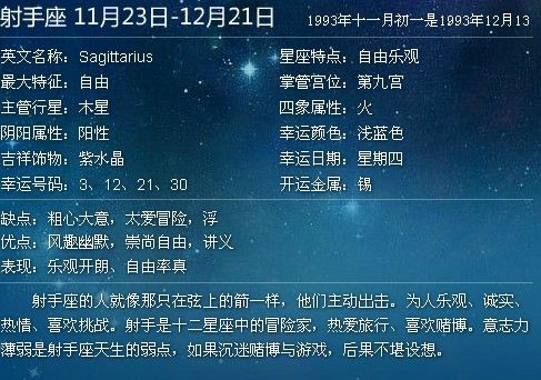 射手座如果你是1993年农历十月初三出生的射手座,那么你就是一个天生的探险家。你的好奇心和冒险精神会带你去探索自然和世界,你的星座会让你自信和开放。你非常兴奋和快乐,喜欢尝试新事物,发现新事物,永远不会满足,永远想要更好。