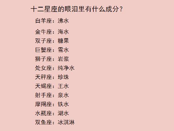 双子座双子座是十二星座中最情绪化的,他们的眼泪是最水性的。双子座很容易受到情绪冲动和波动,也很容易发泄。因此,双子座的眼泪价值不是很高,因为他们经常流泪,所以绝大多数人会习惯他们的眼泪。