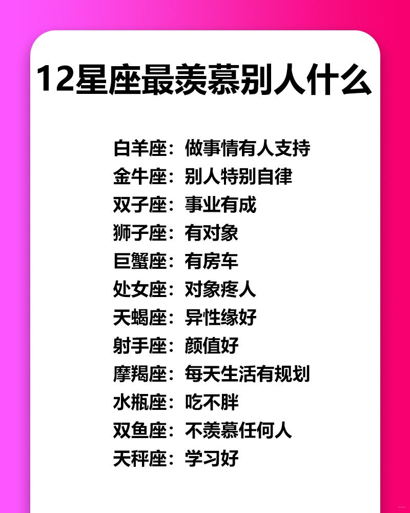 双鱼座:羡慕别人的坚定双鱼座的人非常善良、温柔、富有同情心,但他们经常因为对社会问题的敏感性和对他人的需求而感到疲惫。因此,他们羡慕那些有坚定信念的人。双鱼座的人应该学会如何将自己的情感和知识转化为一种强大而坚定的力量,不要太关注别人的想法,展示自己的独立思考能力。