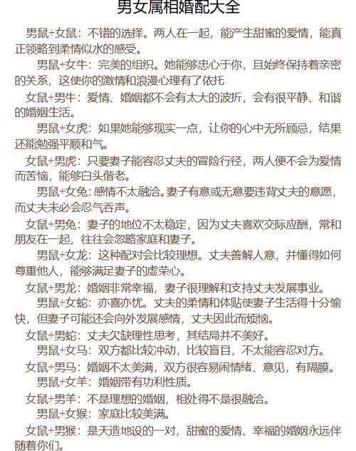 老虎男和鼠女虎男往往有非常顽强的意志和坚定的信念。 而鼠女则有着非常灵活的思维能力和机智的智慧,使她们能够相互学习,形成非常完美的组合。 鼠女一般都比较温柔,喜欢照顾人,而老虎男可能喜欢控制和保护自己的伴侣。 他们互相支持,互相理解,有足够的信任和激励,这对珍惜个人关系的人很有帮助。