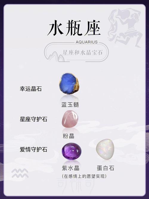 水瓶座(1月20日至2月18日)虽然水瓶座的人独立思考,有创意,但也有点奇怪,非正式。适合佩戴彩色水晶,如彩虹水晶、彩虹石、彩色石材等,可以增强创造性思维,提高洞察力,带来好运和幸福的生活。