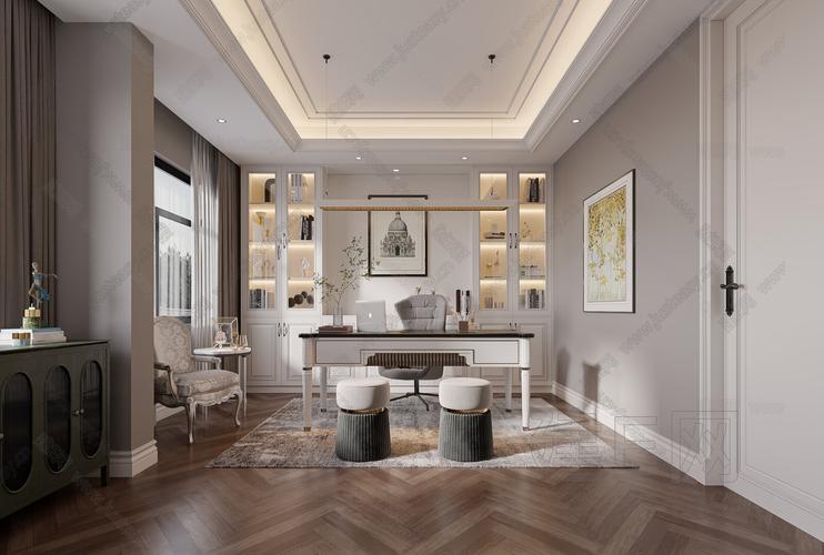 书房的布局书房的布局要宽敞明亮,书房里有足够的人来回活动空间。书架上应放置大量书籍,使书房具有浓厚的学习氛围。家具的大小和形状也很重要。尽量选择方形家具,避免家具太小或太大。此外,书桌和椅子的方向也非常重要。建议桌子面向房间的门,而不是背向。