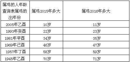 鸡年分别为:2005年、1993年、1981年、1969年、1957年、1945年、1933年、1921年等。鸡年出生的人,坦白直率,想说什么就说什么。自尊心很高,不喜欢别人在背后指责,对别人的要求也同样严格,不易灵活。严格遵守纪律,色彩敏锐。