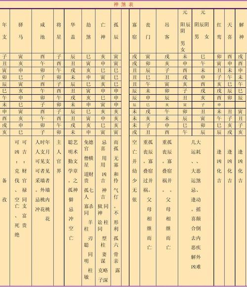 四柱算命是传统文化的一部分。通过观察出生年、月、日、时的天干地支五行属性,分析人的“命运”和人格特征。在四柱算命中,神煞表是一种非常重要的辅助工具,可以帮助分析人的“命运”和未来的发展趋势。以下是四柱算命神煞表的介绍。