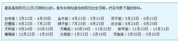 以下是星座日期划分表。你可以通过比较阳历的生日来知道星座是什么。