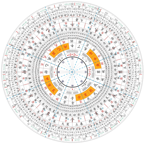 杨盘,也就是世界上称之为三合盘的人,其二十四山盘的红黑是根据天干地支纳甲的河图阴阳确定的,红字为阳,黑字为阴。举震封三山为例,A、B属阳,为红字,毛属阴,黑字。