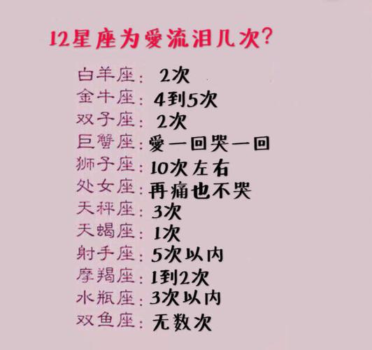 检查12个星座的眼泪指数排名:虽然双鱼座的双鱼座不拒绝,但认真对待每一段关系,投资,是一个非常困难的星座,即使你有能力抛弃他们,那么,只有眼泪可以淹死你几次!眼泪指数:95第二:癌症女孩非常有意识,如果你提出“分手”这个词,她不会纠缠,也不想用眼泪攻击你可怜,但一旦回到温暖的家,她就忍不住了!眼泪指数:90第三名:射手座虽然射手座的女人平时不在乎,但其实她失恋的时候可以哭得肝肠寸断!但别担心,那只是他们情绪的发泄,几天后就会好起来。眼泪指数:80第四名:白羊座刚失恋的白羊座女人可能会哭着踢你,咬你...但不久,当事情平静下来时,他们可能会有“再见或朋友”的想法!眼泪指数:72第五:天秤座的女生虽然不软弱,但大部分男生都输了眼泪攻势;公平就像他们一样,被你甩了,也许有他们会哭着向你求正义!眼泪指数:65第六:处女座属于土象星座的处女座,内心其实很坚强。眼泪不仅是他们的发泄,也是他们的战术。他们不那么容易放弃!眼泪指数:58第七名:金牛座金牛座女生没那么坚强。一旦感情出现问题,他们喜欢努力工作,暂时淹没痛苦。即使有眼泪,也是在业余时间。眼泪指数:50第八名:双子座双子座女生,好的是人缘。看,当她哭到一半的时候,有人会找她玩。玩完之后,一切都可以抛在脑后!眼泪指数:40第九名:摩羯座冷冷的摩羯座,即使你想让她哭,她也做不到。在12个星座的女生中,她们善于掩饰自己的情绪。他们不会哭,只会鄙视你。眼泪指数:33第十:水瓶座瓶子里的女生热情,但也有冷酷的一面。如果你为她感到难过,她的一面无疑会暴露出来。如果事后想挽回,很难!眼泪指数:25第11名:狮子座狮子座女生爱面子,怎么能轻易哭?他们当然会心痛,但他们只会表现出根本不在乎,后丢脸的是你。眼泪指数:15号12号:天蝎座12号星座中强的是天蝎座。他们流血而不流泪。他们坚定的态度令人生畏。除非他们惊天动地地哭泣,否则他们不会想到一滴眼泪!眼泪指数;5