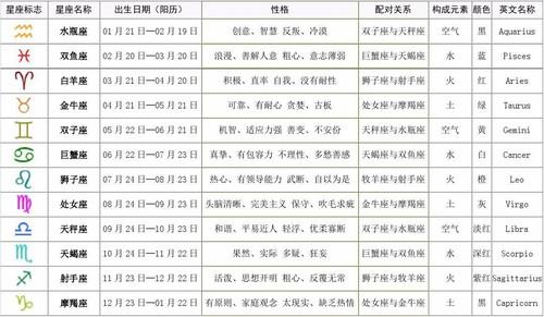 星座名、日期、星座属性、幸运数字、辛运颜色、