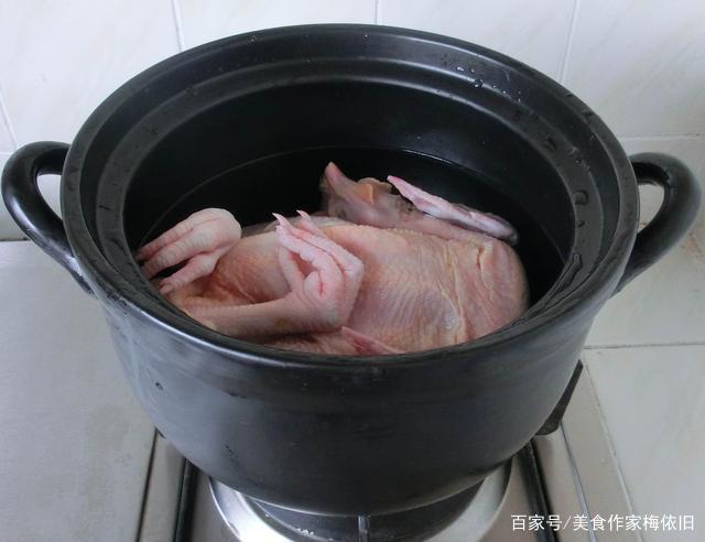1、将鸡切成4厘米见方的鸡块,放入锅中煮沸,倒入汤中。
